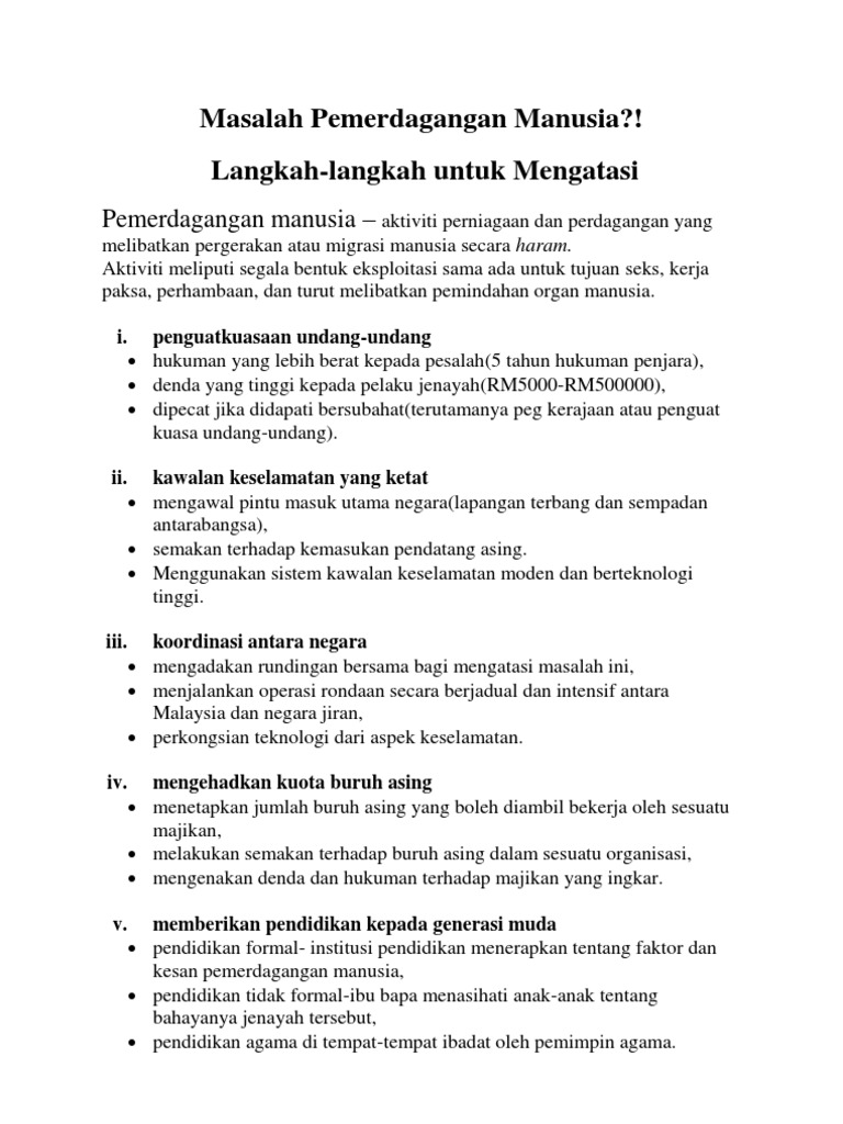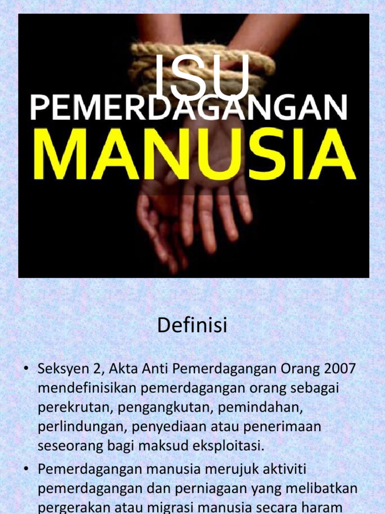 Nurul atikah binti ab aziz 1162809 kaa (taa4) program dakwah & pengurusan islam. Aktiviti pemerdagangan manusia sangat membimbangkan. Pemerdagangan manusia dan langkah untuk mengatasinya. Kita hidup di abad 21 dengan kebebasan hak yang tinggi. Mangsa ditipu untuk dijadikan pelacur. Isu pemerdagangan manusia merupakan isu global yang melanda kebanyakan negara di dunia. Masalah ini akan mendatangkan banyak kesan buruk jika tidak ditangani dengan segera dan e. Masalah ini semakin menular dan berlaku secara global. Pemerdagangan manusia adalah perdagangan dan perniagaan yang melibatkan pergerakan atau migrasi manusia secara haram, termasuk aktiviti buruh secara sah dan secara paksa. Aktiviti pemerdagangan manusia sering dijadikan tajuk utama akhbar harian, tidak kira dari negara mana sekalipun. Mangsa juga banyak yang terlibat dengan penyalahgunaan dadah.❖buruh terikat. Pemerdagangan orang adalah segala perbuatan yang melibatkan pemerolehan atau pengekalan tenaga kerja atau perkhidmatan seseorang melalui paksaan dan termasuklah perbuatan merekrut, mengangkut, memindahkan, melindungi, menyediakan atau menerima seseorang. Satu kempen sosial kepada masyarakat untuk menghentikan aktiviti penghambaan moden masa kini.