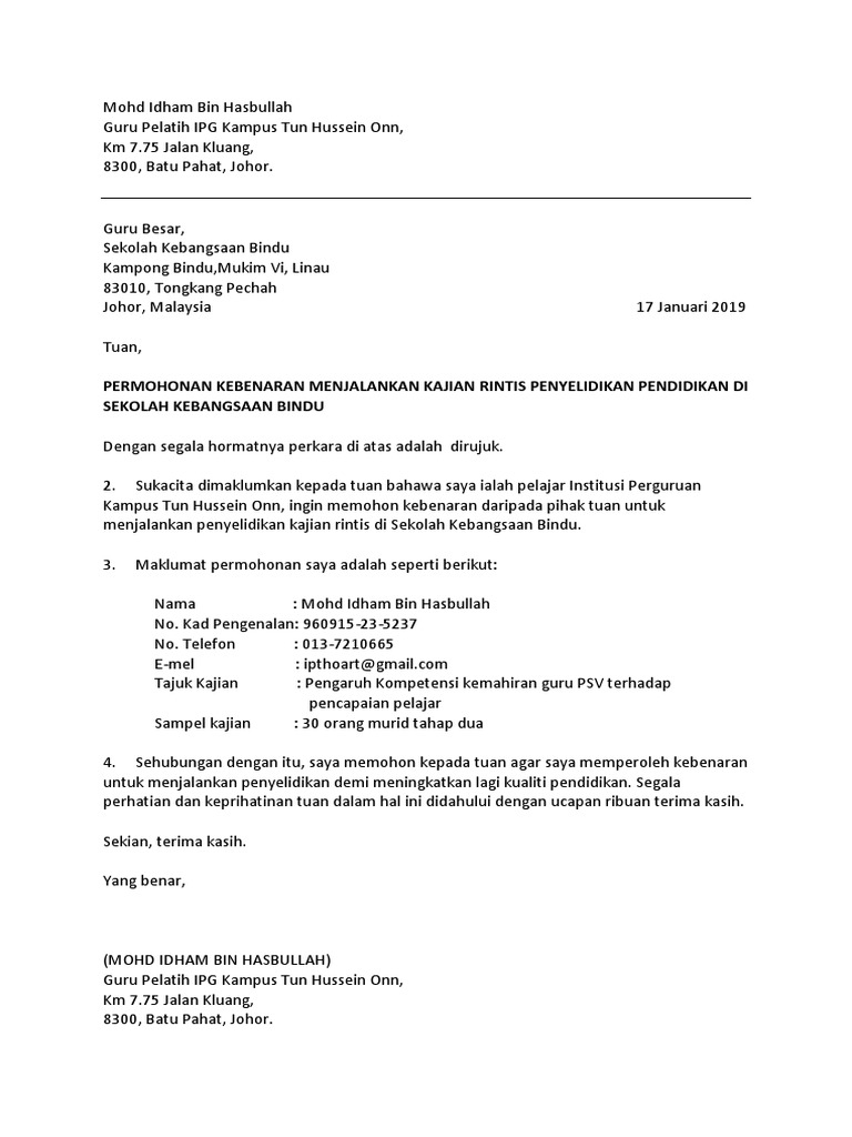 Surat Kebenaran Menjalankan Kajian / Kpm Surat Siaran / Surat pernyataan hutang yang digunakan untuk menyatakan bahwa seseorang telah berhutang dan akan melunasi hutangnya sesuai dengan tanggal jatuh demikian surat pernyataan ini saya buat sesuai dengan keadaan dan fakta yang sebenarnya, serta tidak ada paksaan sama sekali dan akan.. Tidak lain dia adalah paulus, seorang pengkhianat yang menyusup seolaholah menjadi murid yesus. (carakerja), kolej sains kesihatan bersekutu yang sedang menyediakan satu projek kajian bertajuk. Pertanyaannya, benarkah nabi yusuf dan zulaikha menikah, dan menjadi pasangan sejati, penuh cinta dan rahmat. Surat permohonan kebenaran menjalankan kajian di sekolah via www.scribd.com. Tuan, permohonan kebenaran menjalankan kajian penyelidikan sarjana muda di sekolah menengah di perak (daerah: